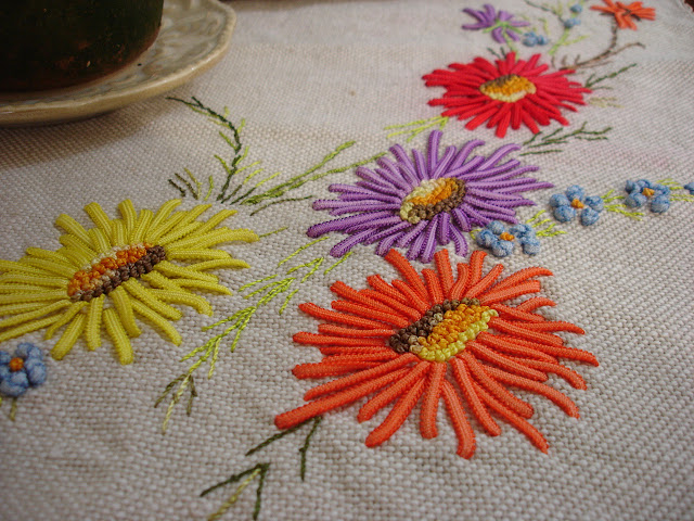 sobre lençol que virou toalha de mesa, ela mesmo bordou a mais de 30 anos, como estava meio amarelado, dei bobeira em colocar de molho no omo, e este desbotou a fita vermelha e manchou um pouquinho, se repararem bem vão ver a mancha, mas não me importo, sou encantada com ele assim mesmo, o jogo tem 2 outros pequeninos que uso na cesta de pão.